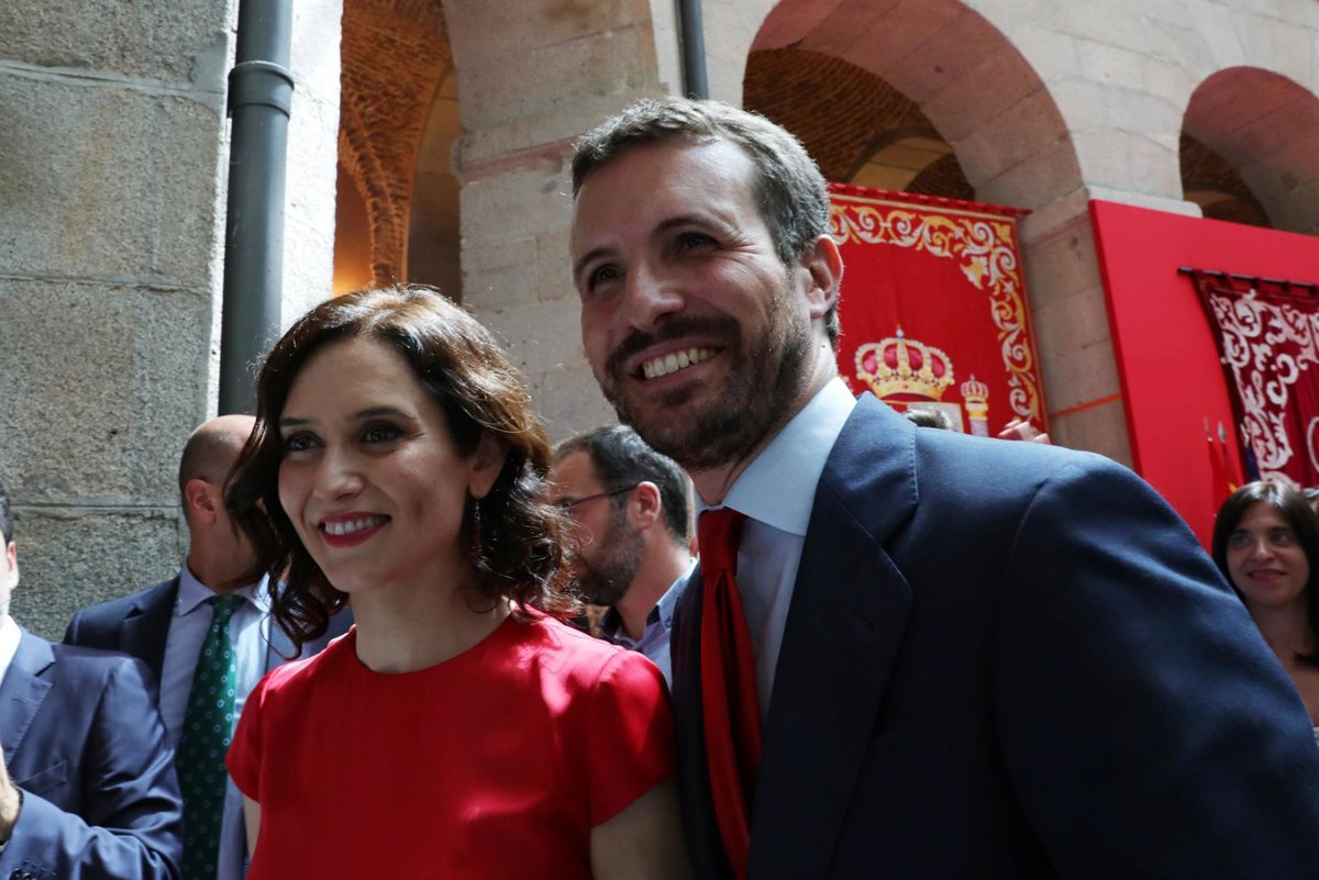 La nueva presidenta de la Comunidad de Madrid, Isabe Díaz Ayuso y el presidente del Partido Popular, Pablo Casado, posan juntos tras el acto de toma de posesión del cargo de Ayuso como presidenta de la comunidad. - JESÚS HELLÍN/ EUROPAPRESS - Archivo