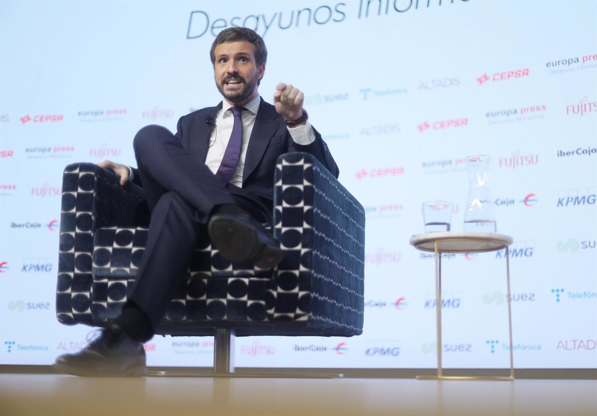 En un desayuno informativo de Europa Press, Casado ha achacado a un "globo sonda" de Moncloa el debate sobre la foto con Vox en la manifestación convocada por la plataforma que integran Rosa Díaz, Fernando Savater o María San Gil contra la medida de gracia a los condenados por el referéndum ilegal del 1 de octubre.