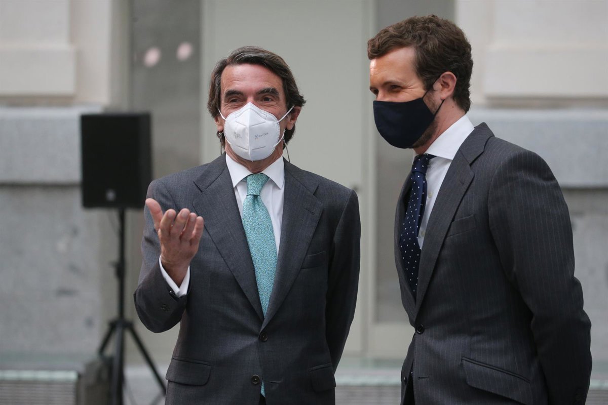 El expresidente del Gobierno y presidente del IADG, José María Aznar, conversa con el líder del PP, Pablo Casado, durante el acto de entrega de las Medallas de Honor, Oro y Plata del Ayuntamiento de Madrid. - I.Infantes.POOL - Europa Press