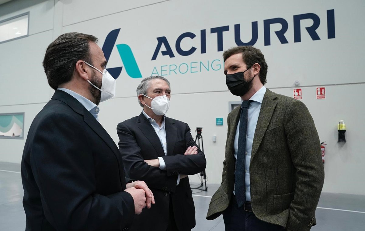 El líder del PP, Pablo Casado, en una visita a una empresa aeronáutica en Miranda de Ebro (Burgos). - PP