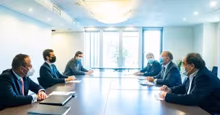 El líder del PP, Pablo Casado, se reúne en la sede del PP con la asociación 'La España que reúne', integrada entre otros por Nicolás Redondo y Francesc de Carreras. En Madrid, a 6 de octubre de 2020. - DAVID MUDARRA (PP)