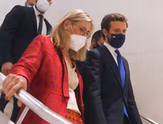 La presidenta de CEAPI, Nuria Vilanova; y el líder del PP, Pablo Casado, a su llegada a la segunda jornada del IV Congreso Iberoamericano Consejo Empresarial Alianza por Iberoamérica (CEAPI), a 18 de mayo de 2021, en el CaixaForum, Madrid, (España). - Cézaro De Luca - Europa Press