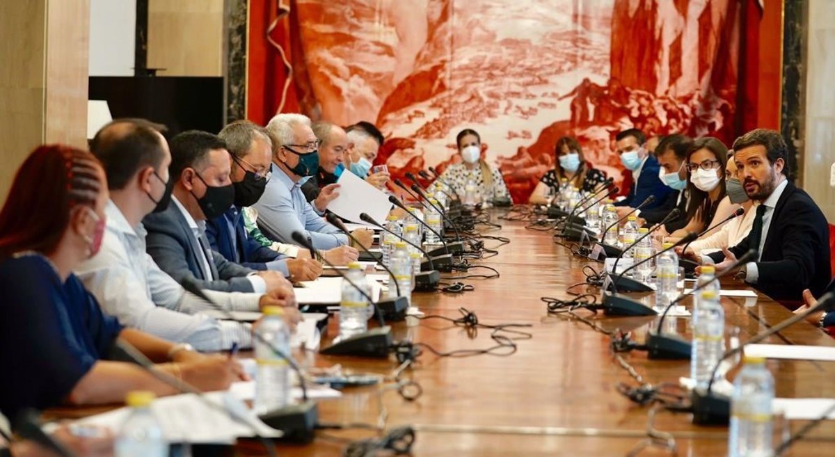 El presidente del PP, Pablo Casado, y la portavoz del Grupo Popular, Cuca Gamarra, se reúnen en el Congreso con sindicatos de Cuerpo Nacional de Policía y asociaciones de la Guardia Civil. En Madrid, a 20 de julio de 2021. - DAVID MUDARRA (PP)