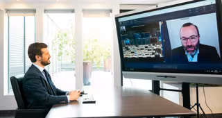 El líder del PP, Pablo Casado, en una reunión telemática con grupos parlamentarios populares europeos. En Madrid, a 22 de febrero de 2021. - DAVID MUDARRA (PP)