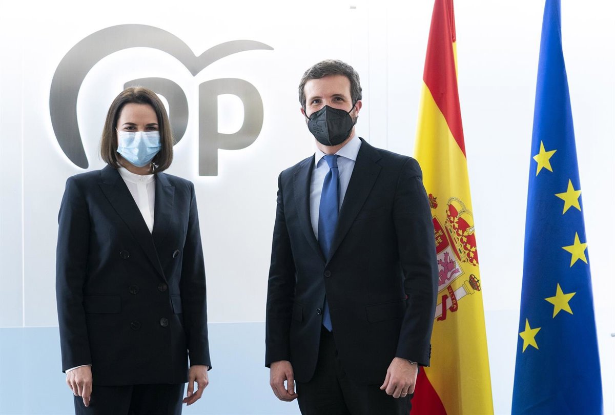 El presidente del Partido Popular, Pablo Casado, se ha reunido este martes con la líder opositora bielorrusa Svetlana Tijanovskaya, a la que ha trasladado su condena a la "represión del régimen" del presidente de Bielorrusia, Alexander Lukashenko.