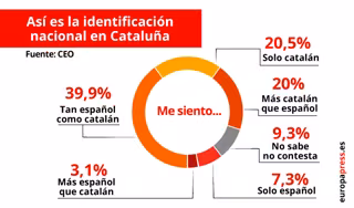 El 39,9% de catalanes se siente tan español como catalán, frente al 20,5% que se considera sólo catalán y al 20% que se siente más catalán que español, según una encuesta del Centre d'Estudis d'Opinió (CEO) de la Generalitat recogida por Europa Press.
