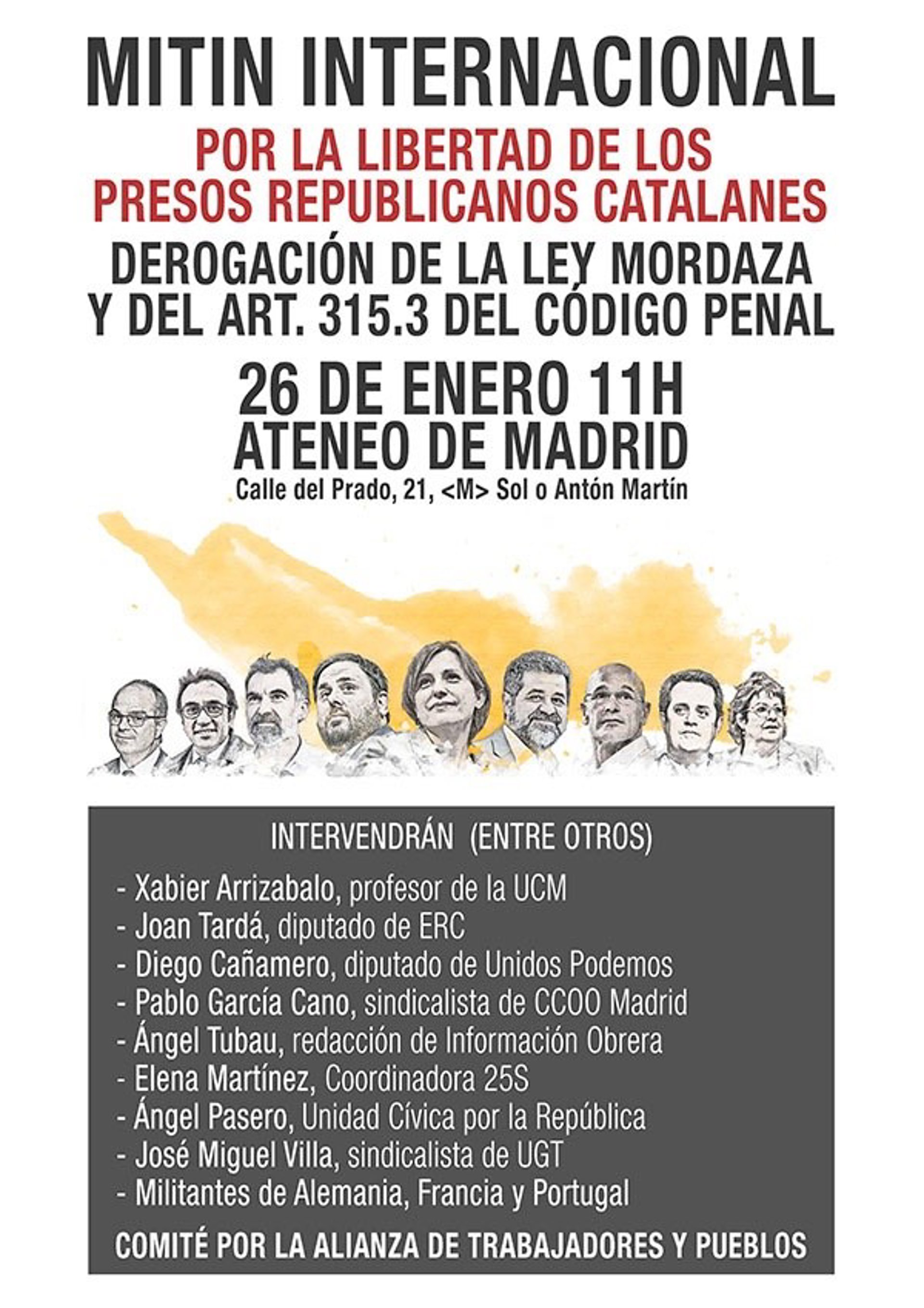 El acto, que se celebrará en el Centro Cultural Blanquerna, vinculado a la Generalitat de Cataluña, tiene como motivo central exigir "la libertad de los presos republicanos catalanes", aunque también se reclamará la derogación de la Ley de Seguridad Ciudadana y la del artículo 315.3 del Código Penal, que prevé cárcel para acciones de piquetes en una huelga.