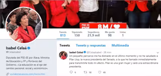 Una de las que ha pasado de largo sin saludar a Llop ha sido Celaá, quien después ha explicado lo sucedido a través de un mensaje publicado en su cuenta de Twitter y recogido por Europa Press.