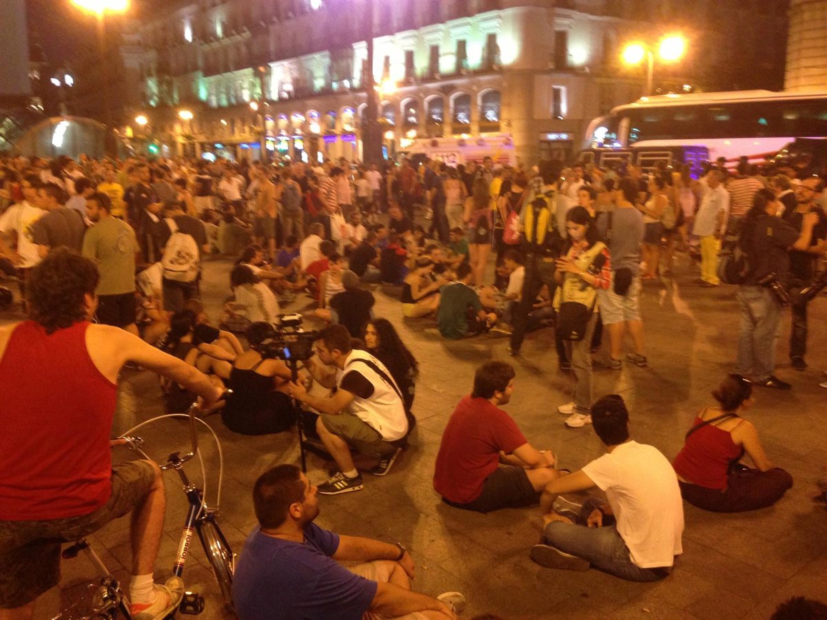 La marcha ha proseguido entonces por Serrano para volver poco después a la plaza de Colón, donde los manifestantes han vuelto a cortar el tráfico unos instantes, y proseguir hacia Cibeles nuevamente para bajar por la Gran Vía hasta la Puerta del Sol, donde han protagonizado una sentada pasadas las diez de la noche.