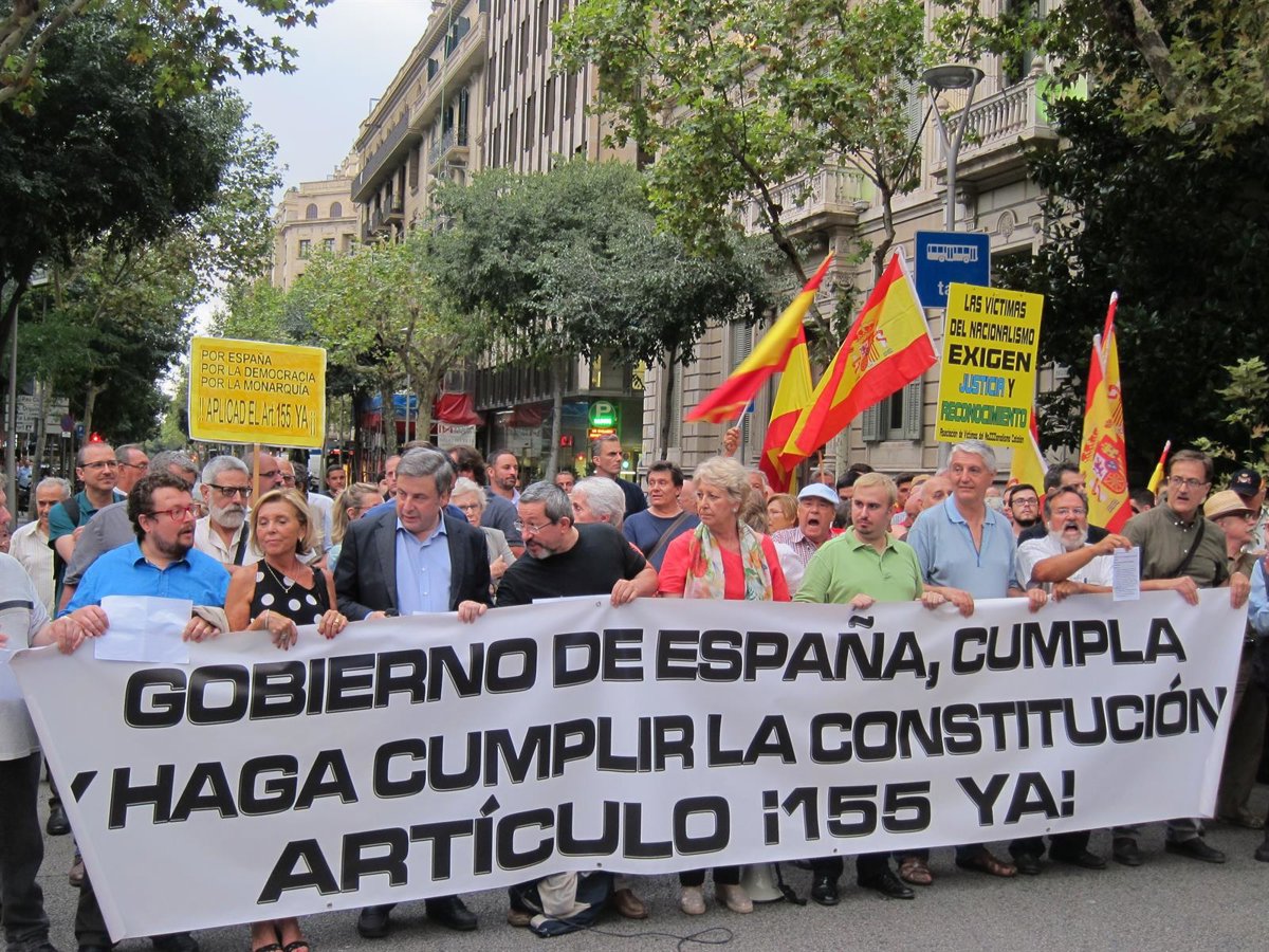 Los asistentes a la concentración, convocada por los partidos VOX y Unidos Sí y las entidades Asociación Cultural del Progreso, Convivencia Cívica Catalana y Somatemps, han exigido al Gobierno central actuar "contra el referéndum ilegal que quiere convocar la Generalitat y reafirmar la soberanía de la ley".