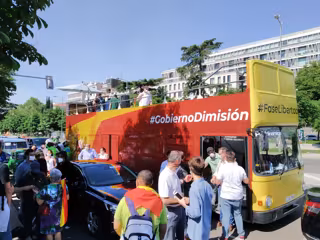 En la cabecera se encuentra un autobús descapotable en el que está el líder de Vox, Santiago Abascal, y distintos dirigentes de la formación como Javier Ortega-Smith, Iván Espinosa de los Monteros o Rocío Monasterio.