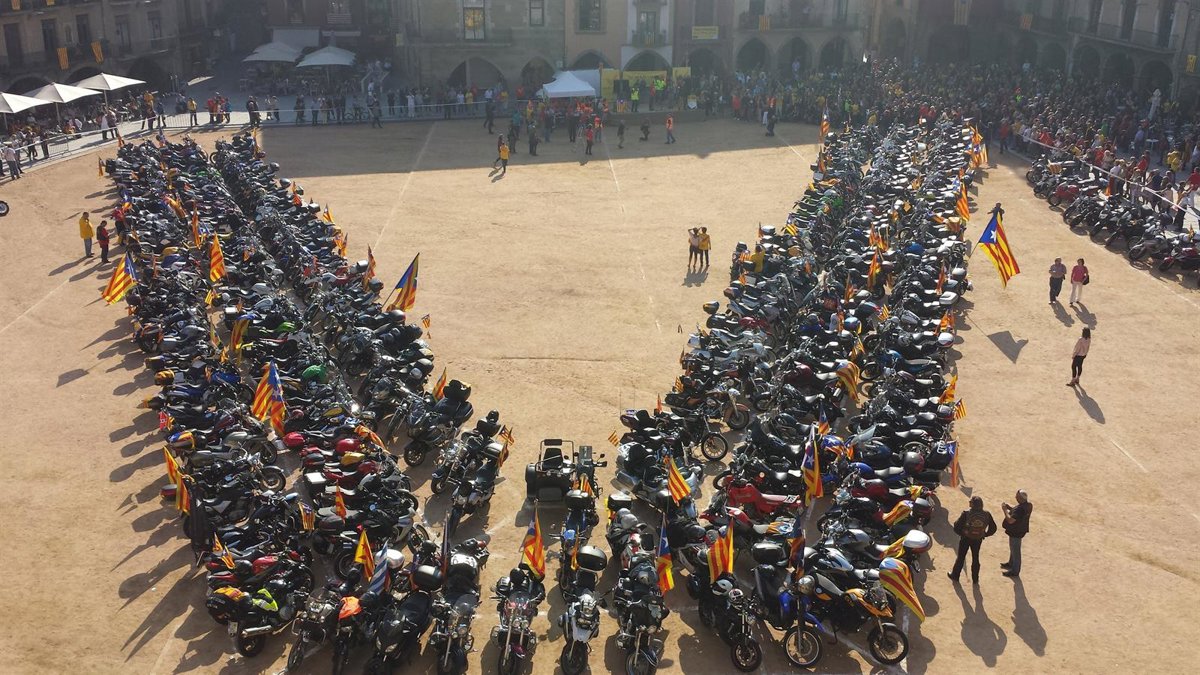 Centenares de moteros han formado este jueves una 'V' en Vic (Barcelona) antes de desplazarse a la capital catalana para participar en la concentración organizada por la Assemblea Nacional Catalana (ANC) y Òmnium Cultural en apoyo al proceso soberanista y a la consulta de autodeterminación que el Govern quiere convocar para el 9 de noviembre.