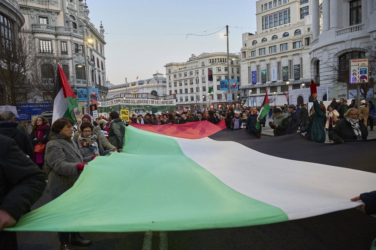 La manifestación, enmarcada en la 13ª movilización estatal convocada por la Red Solidaria contra la Ocupación de Palestina (RESCOP) bajo el lema 'Paremos el genocidio en Palestina', ha arrancado a media tarde en la Plaza de Cibeles y ha cruzado sin incidentes el centro de la ciudad.
