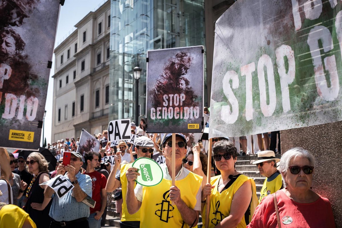 Centenares de personas se han concentrado este sábado en Madrid para pedir "el fin del genocidio" en Gaza en una convocatoria que se ha celebrado en casi 140 poblaciones de todo el país y ha contado con el apoyo de más de un centenar de personalidades de la cultura como el director Pedro Almodóvar, la actriz Malena Alterio o el músico Miguel Ríos.