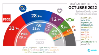 Con ello, el PSOE amplía hasta los 4 puntos su ventaja sobre los 'populares', dando la vuelta al empate técnico de septiembre (0,7 puntos) y a la distancia de casi dos puntos que le sacó el PP el pasado julio, la única vez que el CIS de Tezanos no dio la victoria a los socialistas.