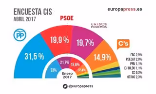MADRID, 9 May. (EUROPA PRESS) - En medio de sus primarias, los socialistas se anotan su tercer aumento consecutivo desde la abstención mientras cae Podemos El Barómetro de Opinión del Centro de Investigaciones Sociológicas (CIS) del mes de abril, el segundo con intención de voto desde la investidura de Mariano Rajoy, mantiene al PP como primera fuerza con un respaldo electoral del 31,5%, un punto y medio menos que en las generales, mientras que el PSOE recupera la segunda plaza superando a Unidos Podemos y Ciudadanos gana casi dos puntos respecto a su resultado de junio de 2016. La encuesta se realizó en los primeros días de abril, después de que Pablo Iglesias hubiera ganado la asamblea de Podemos, la andaluza Susana Díaz se hubiese postulado para las primarias del PSOE y el PP hubiera sufrido la crisis de Murcia que provocó la dimisión del entonces presidente regional, Pedro Antonio Sánchez. Eso sí, las entrevistas se realizaron antes de que estallase el 'caso Lezo' que ha llevado a prisión al expresidente madrileño Ignacio González. El CIS atribuye al PP una estimación de voto del 31,5%, un punto y medio menos que en la encuesta de enero y que en las generales de junio de 2016. Es su peor dato desde las fechas previas a las elecciones del 20 de diciembre de 2015. PODEMOS CAE DOS PUNTOS EN EL PULSO IGLESIAS-ERREJÓN Aún así, el partido de Mariano Rajoy mantiene una cómoda ventaja de más de 11 puntos sobre sus perseguidores. Por primera vez en la legislatura, ahora es el PSOE quien ocupa la segunda plaza, con un respaldo electoral del 19,9%, dos décimas más que Unidos Podemos y sus confluencias. Los socialistas se anotan su tercera subida consecutiva en las encuestas del CIS, aunque todavía están lejos del 22,66% que marcaron en las elecciones generales de junio de 2016. Esa caída de dos puntos se atribuye directamente a la coalición Unidos Podemos, pues las confluencias mantienen sus mismas cifras: En Comú marca un 3,7%, la alianza valenciana con Compromís sube al 2,9% y En Marea se queda en un 1,2%. Unidos Podemos, por su parte, está por debajo de su resultado de los últimos comicios, que fue del 21,1% frente al 19,7% que le atribuye ahora el CIS y se deja dos puntos en los últimos tres meses, precisamente los que ocupan todo el proceso asambleario que enfrentó a Pablo Iglesias con Iñigo Errejón, con derrota final del segundo. Eso sí, el voto a Unidos Podemos está más comprometido porque supera al PSOE en intención directa (voto ya decidido), con un 14,1% frente al 13,4% de los socialistas y el 20% de entrevistados que aún no adelantan su respaldo. En todo caso, el PP también es aquí el partido con mejor porcentaje, con un 18,5%. CS SUBE 2 PUNTOS DESDE JUNIO Y 2,5 DESDE ENERO El CIS reserva la cuarta plaza para Ciudadanos, la fuerza que más crece. Precisamente en los días posteriores a hacer caer al presidente de Murcia por su imputación, el partido naranja obtiene una estimación de voto del 14,9% casi dos puntos más que en las generales de 2016, dos puntos y medio por encima que hace tres meses antes y su mejor dato del último año. Respecto a las formaciones territoriales, Esquerra gana al PDeCAT con un 2,9 frente a un 2%, ambos por debajo de En Comú, mientras que el PNV y Bildu empatan en un 1,1% al caer siete décimas los nacionalistas. En cuanto a la valoración de líderes, el mejor puntuado vuelve a ser Joan Baldoví, de Compromís, que sube hasta los 4,54 puntos, seguido de Xavier Domènech, de En Comú, con una nota media de 4,27. Entre los dirigentes de ámbito estatal destaca Alberto Garzón, de IU, con 4,26, y detrás quedan el socialista Javier Fernández, que repite el 4,12 de enero, y Albert Rivera (Cs) con 3,68, mientras que Mariano Rajoy sólo se anota un 2,91 y Pablo Iglesias se queda en 3 puntos. EL GOBIERNO, MEJOR VALORADO QUE LA OPOSICIÓN DEL PSOE Entre los ministros, se mantiene en cabeza la vicepresidenta Soraya Sáenz de Santamaría, con una nota de 3,79 puntos, seguida de Íñigo Méndez de Vigo (Educación y Portavoz) e Isabel García Tejerina (Agricultura), con 3,23 y 3,18 puntos, respectivamente. Cierra la tabla el titular de Justicia Rafael Catalá, con 2,73. La labor del Gobierno es elogiada como buena o muy buena por un 12,2% de los encuestados, mientras que un 53,1% la considera mala o muy mala. En todo caso, son mejores datos que los de la oposición del PSOE, descalificada por un 61% y sólo tildada de buena o muy buena por un 4,6%. Es3173mar A by Epinternet on Scribd