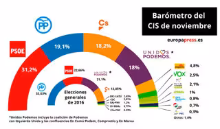 La suma de Unidos Podemos y sus confluencias, por su parte, sube siete décimas hasta marcar en noviembre un 18%, un porcentaje en la media de lo que viene marcando durante todo 2018, pero que aún está lejos del 21,15% que se anotó en las generales de 2016. Todos los socios de la coalición suben unas décimas en noviembre respecto a octubre, excepto En Comú, que pasa de 3,2 al 2,8%.