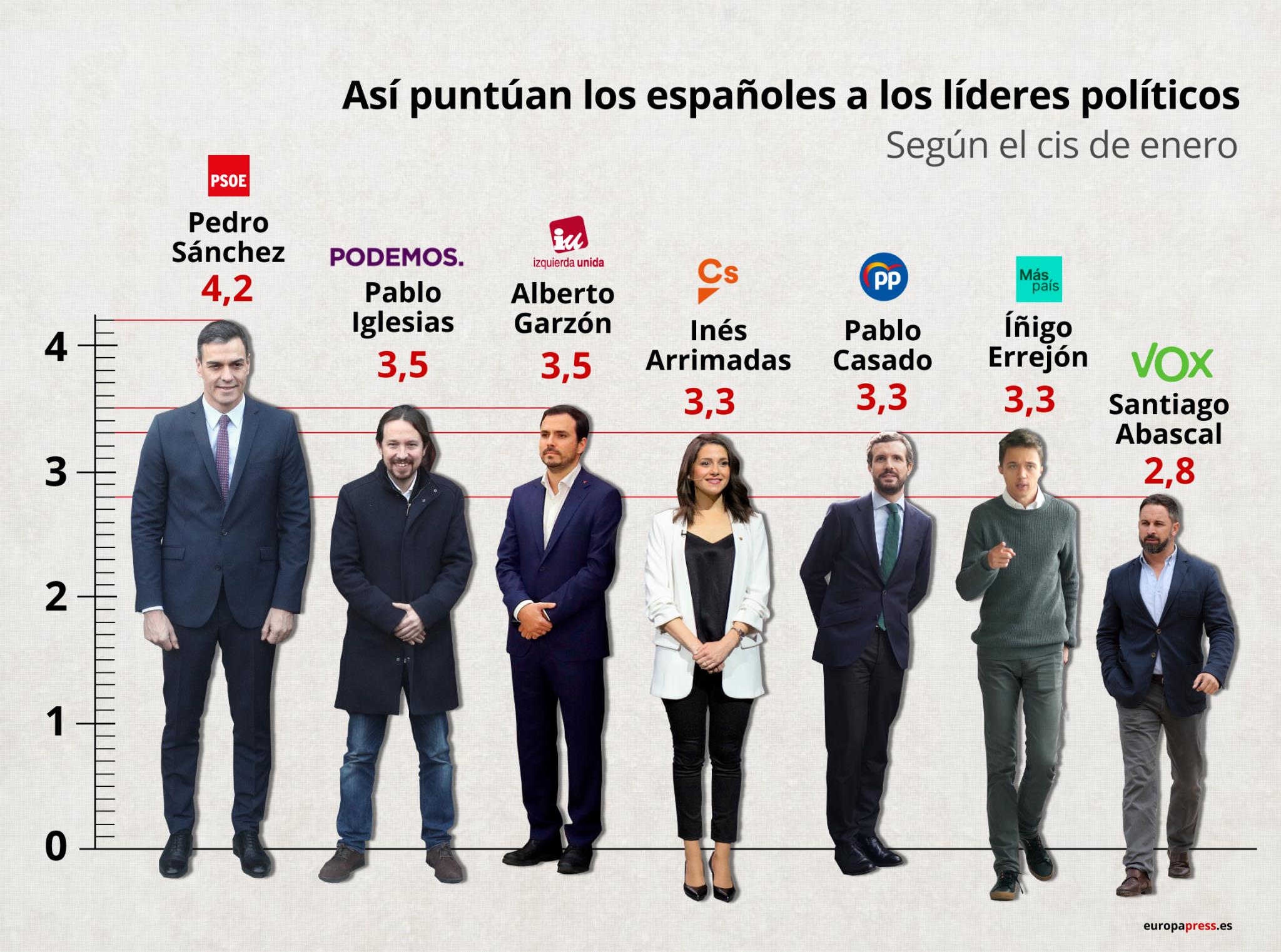 En cuanto a los líderes de los partidos, todos siguen muy lejos del aprobado. El socialista Pedro Sánchez repite en cabeza con una nota de 4,2 puntos y detrás de él figuran sus socios de Gobierno de Podemos, Pablo Iglesias, y de IU, Alberto Garzón, con 3,5 puntos cada uno. Después figuran Pablo Casado (PP), Inés Arrimadas (Ciudadanos) e Íñigo Errejón (Más País) con 3,3, y cierra Santiago Abascal, presidente de Vox, con 2,6.