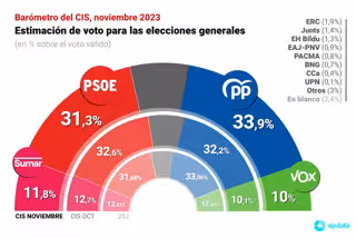 El Barómetro de Opinión realizado por el Centro de Investigaciones Sociológicas (CIS) a principios de noviembre sitúa al PP con una ventaja de 2,6 puntos sobre el PSOE, que pierde punto y medio en un mes marcado por las negociaciones de la amnistía.