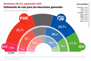El Barómetro de Opinión del mes de septiembre realizado por el Centro de Investigaciones Sociológicas (CIS) mantiene al PSOE como primera fuerza y aumenta a nueve puntos su ventaja sobre el PP, para el que pronostica su peor porcentaje de intención de voto de la legislatura. En concreto, el sondeo otorga al PSOE una estimación del 32,7%, frente al 23,7% que calcula para los 'populares'.