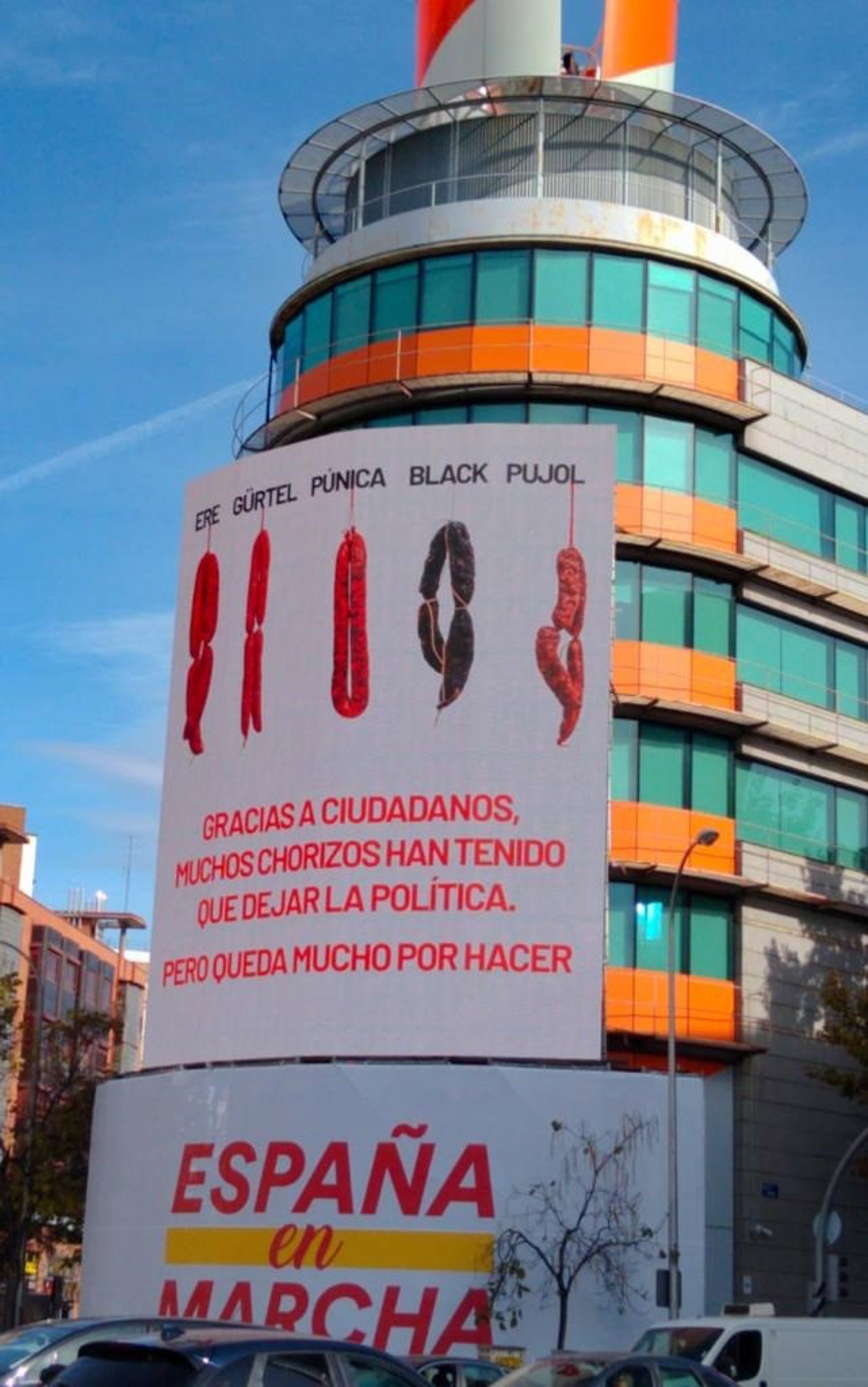 La fachada de la sede de Ciudadanos en Madrid con una imagen con chorizos para denunciar la corrupción. - CIUDADANOS