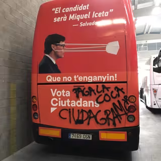 Ciudadanos ha denunciado que el autobús que ha puesto a circular en Girona como parte de la campaña para las elecciones catalanas del 14 de febrero ha amanecido este lunes con una pintada en la parte trasera que, según se ve en unas fotografías difundidas por el partido, dice "paga la coca, Ciudagramos".