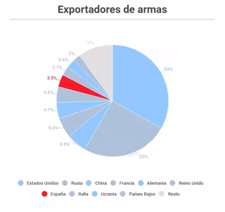 Según SIPRI, solo Estados Unidos y Rusia se reparten el 58% de las exportaciones de armamento y muy por detrás, China, Francia, Alemania, Reino Unido, España, Italia, Ucrania y Países Bajos completan el 'top 10' de los países que más armas suministran.