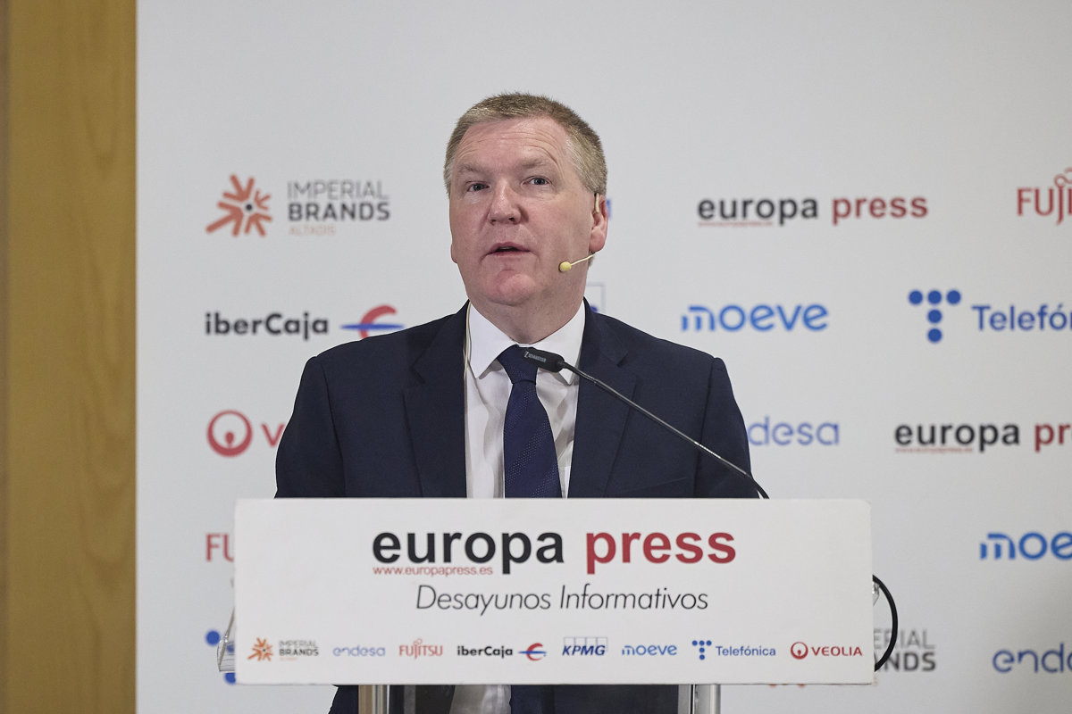 El Comisario Europeo de Democracia, Justicia, Estado de Derecho y Protección de los Consumidores, Michael McGrath, durante un desayuno informativo organizado por Europa Press, a 21 de abril de 2026, en Madrid (España). - Jesús Hellín - Europa Press