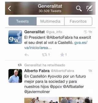 En un comunicado, la coalición ha señalado que han sido los internautas quienes les han dado "la voz de alarma" al ver que desde la cuenta oficial de la Generalitat se retuiteaban las publicaciones de Fabra, quien hacía público que había ido a votar y daba su "expreso" apoyo al PPCV, al candidato a la alcaldía de Castelló, Alfonso Bataller y al presidente en funciones de la corporación provincial castellonense, Javier Moliner.