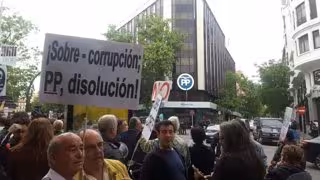 Los manifestantes, encajonados en la acera de los números pares de la calle Génova, intransitable por la aglomeración de personas, han gritado consignas contra la corrupción en el PP como 'Manos arriba, esto es un atraco' o 'No es un partido, es una mafia'.