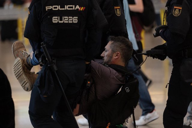 Un manifestante en el aeropuerto de Barcelona-El Prat. David Zorrakino / Europa Press