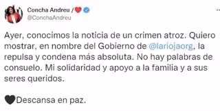 En un tuit que ha publicado hace unos minutos, Andreu señala que "ayer, conocimos la noticia de un crimen atroz". "Quiero mostrar, en nombre del Gobierno de @lariojaorg la repulsa y condena más absoluta", añade.