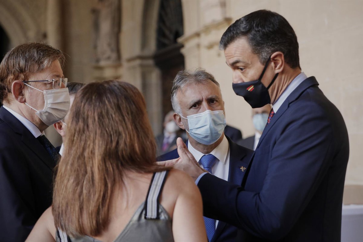 Archivo - El presidente del Gobierno, Pedro Sánchez, habla con los presidentes de la Comunidad Valenciana, Canarias y Baleares -Ximo Puig (con gafas), Ángel Víctor Torres y Francina Armengol-en el monasterio de Yuso, antes de la celebración de la XXI Co - Jesús Hellín - Europa Press - Archivo