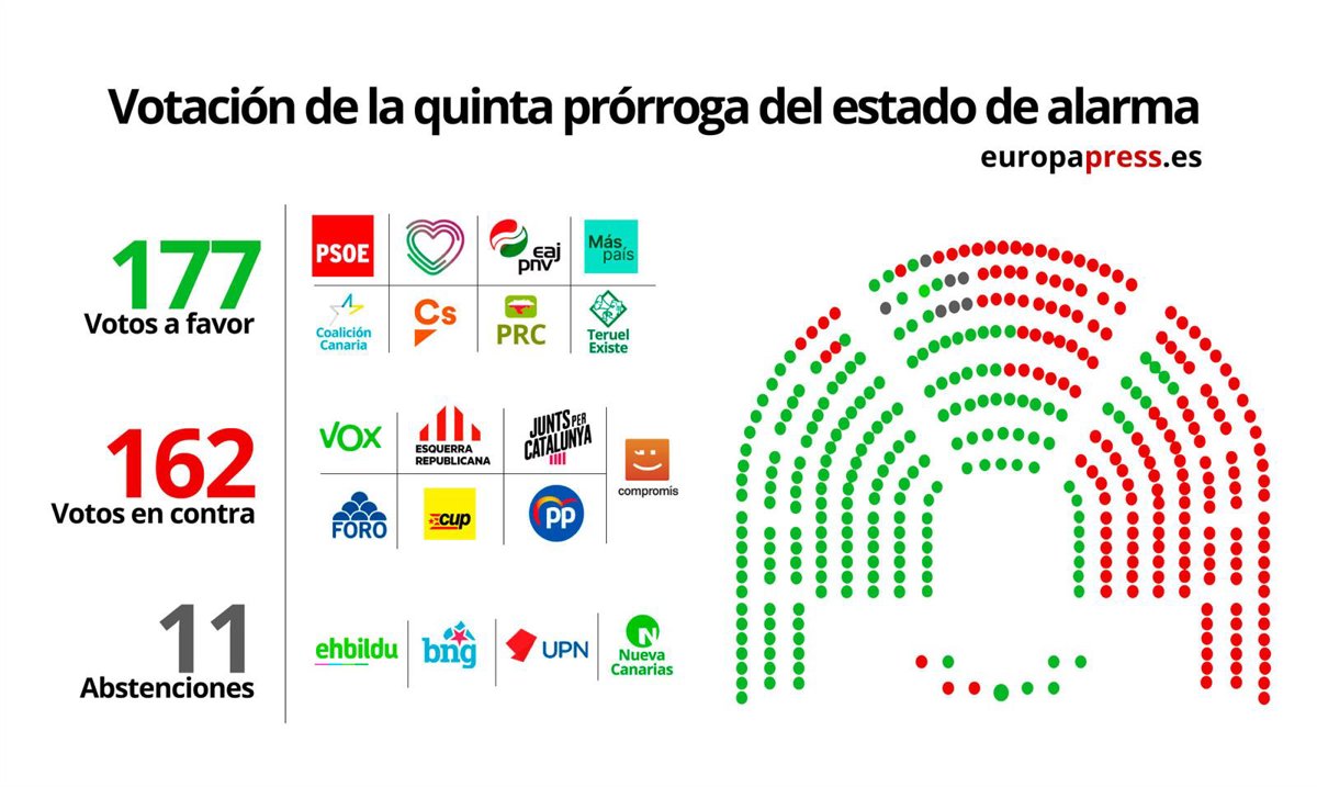 El Pleno del Congreso ha aprobado este miércoles la quinta prórroga del estado de alarma decretado por el Gobierno por la pandemia del coronavirus, que llevará las restricciones hasta las cero horas el próximo 7 de junio. Aunque ha alcanzado justo la mayoría absoluta, sumando 177 votos, esta nueva ampliación ha encontrado más oposición que nunca pues el PP se ha pasado al 'bloque del No', donde ya estaban Vox y los independentistas de ERC y Junts, entre otros.