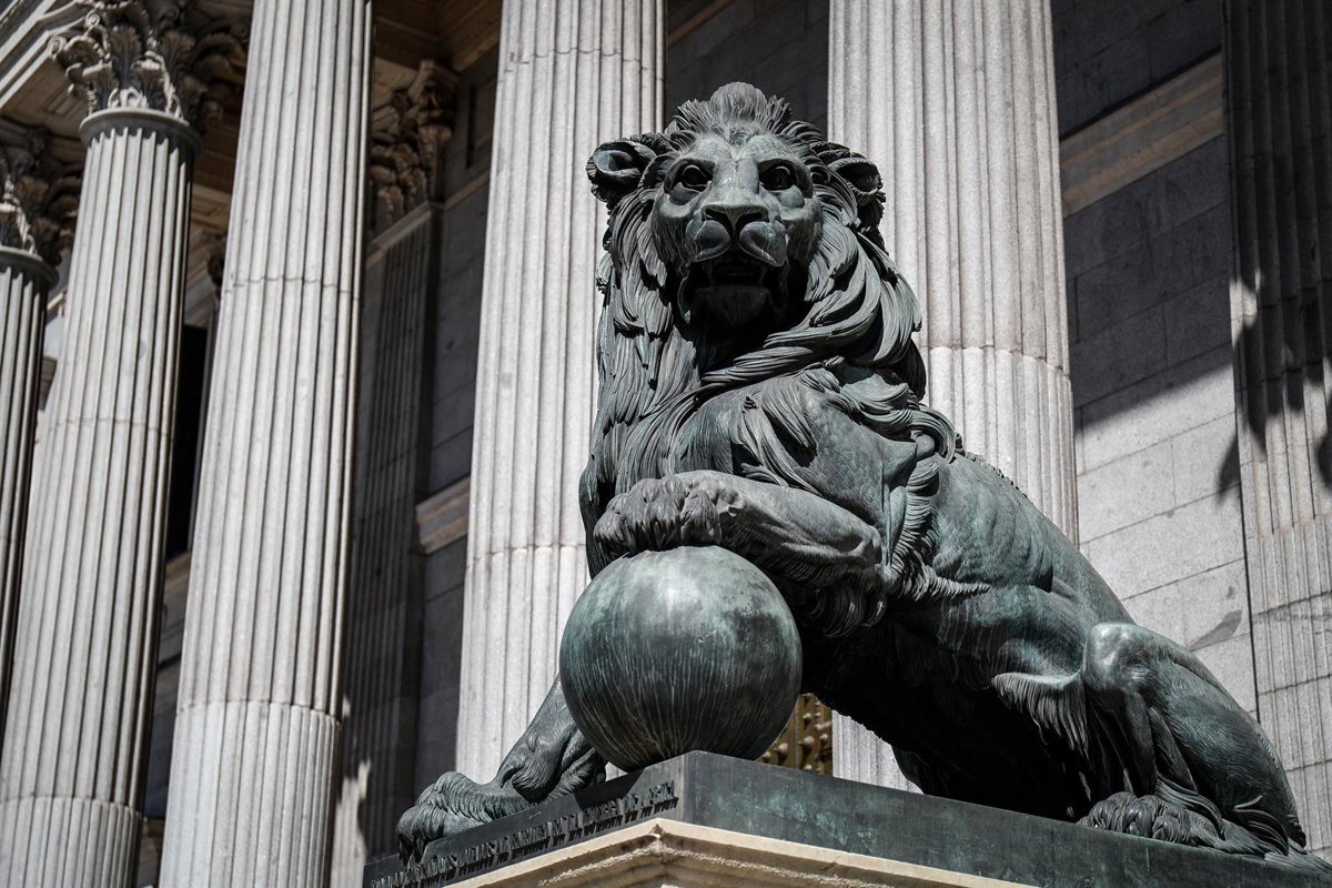 Archivo - Uno de los emblemáticos leones que se encuentran delante de la fachada del Congreso de los Diputados en la Plaza de las Cortes de Madrid. - Óscar J.Barroso - Europa Press - Archivo
