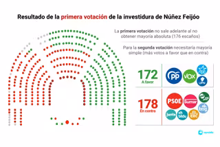 En esta primera votación se requería mayoría absoluta, 176 apoyos, pero Alberto Núñez Feijóo no sólo no ha llegado a esa cifra, sino que ni siquiera ha ganado pues ha obtenido 172 votos del PP (137 diputados), Vox (33), Coalición Canaria (1) y UPN (1), frente a los 178 'noes' que han sumado PSOE (121), Sumar (31), ERC (7), Junts (7) Bildu (6), PNV (5) y BNG (1).