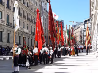 Tras la presentación del libro se ha iniciado un desfile de Pendones del Reino de León por la Carrera de San Jerónimo, que ha finalizado en la escalinata del Congreso con una foto de familia ante la Puerta de los Leones.