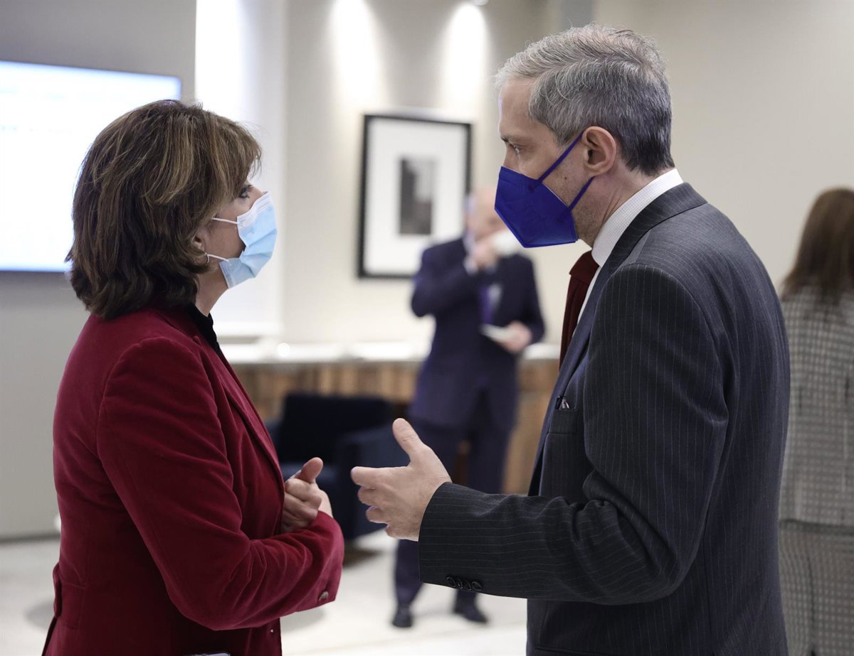 La Fiscal General del Estado, Dolores Delgado, conversa con el director de Europa Press, Javier García Vila, en un desayuno Informativo de Europa Press, en el Auditorio El Beatriz Madrid, a 20 de diciembre de 2021, en Madrid, (España). - Eduardo Parra - Europa Press