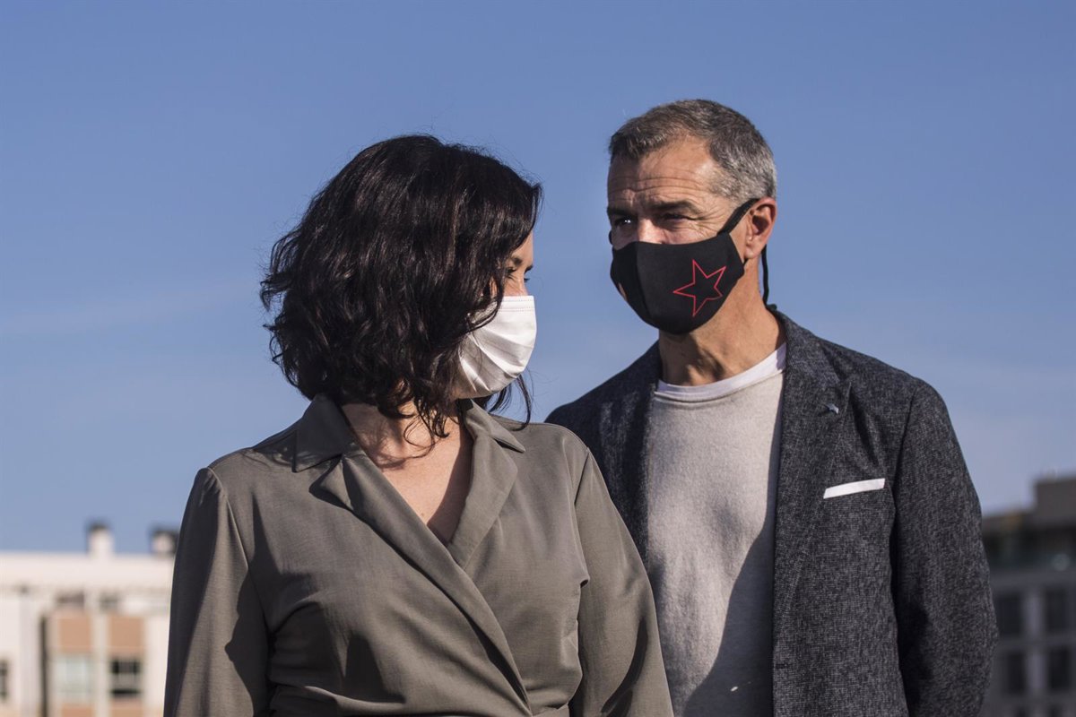 La presidenta de la Comunidad de Madrid y candidata a la reelección, Isabel Díaz Ayuso (i) y el candidato número 5 a las elecciones de la Asamblea de Madrid, Toni Cantó. - A.Martínez Vélez. Pool - Europa Press