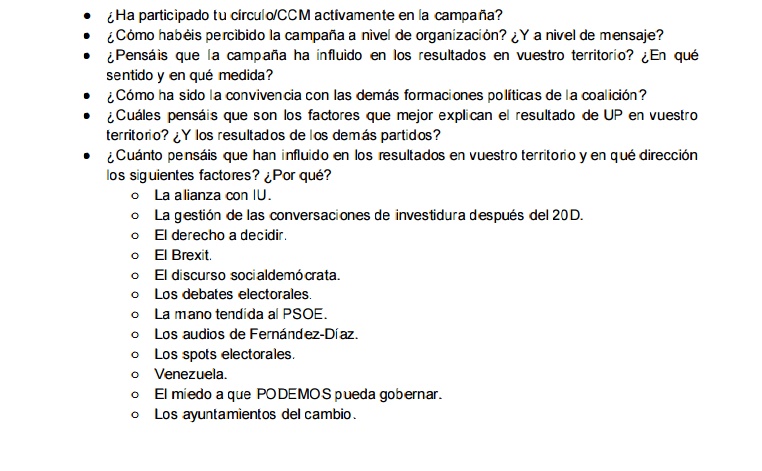 En un documento interno, Podemos realiza a sus bases una serie de preguntas generales, como la manera en la que han percibido la campaña a nivel de organización, para a continuación pedir que analicen cómo creen que han influido una serie de posibles factores en los resultados "no satisfactorios".