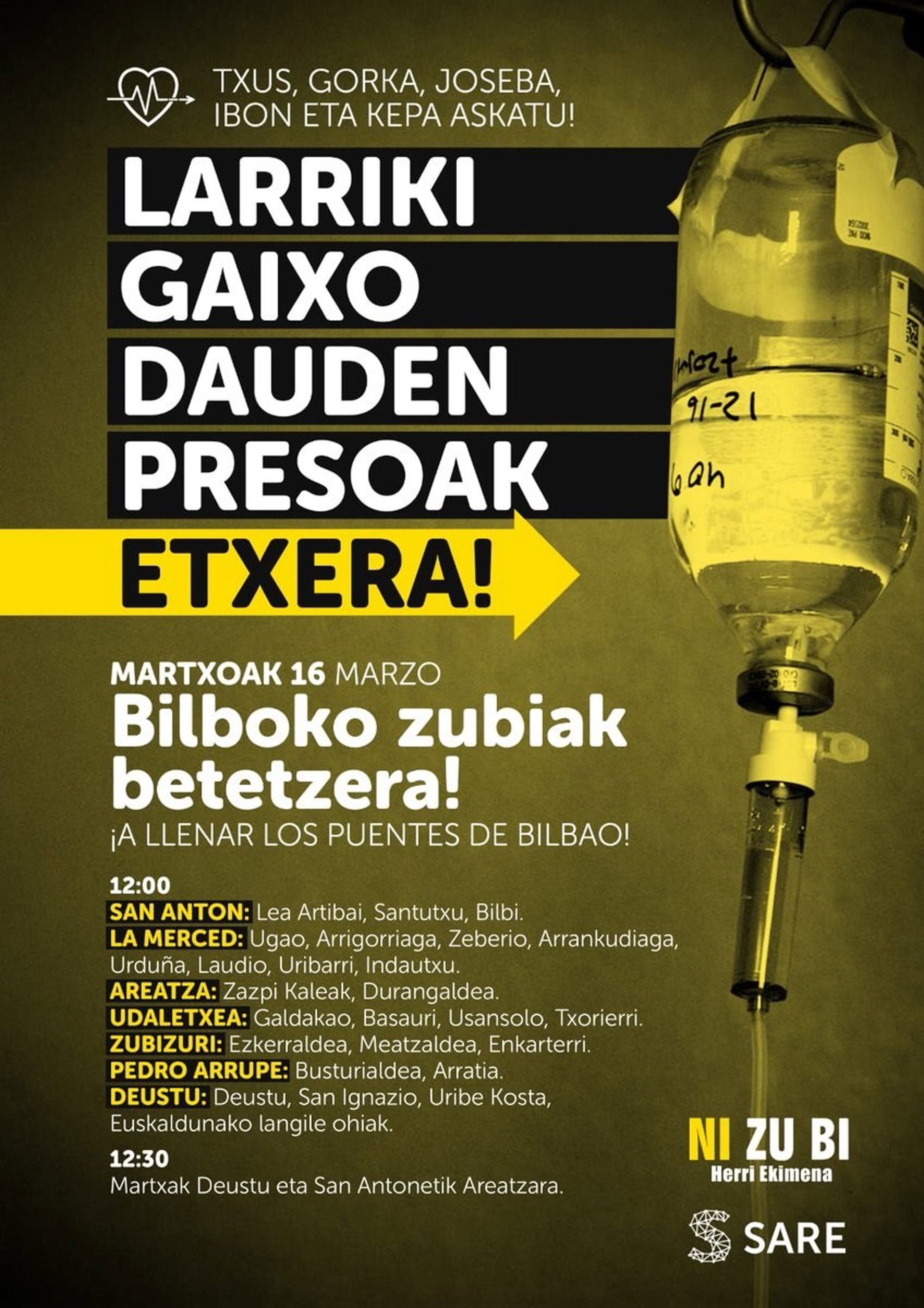 Una iniciativa popular para reclamar la libertad de los presos de ETA enfermos ha anunciado concentraciones para el próximo 16 de marzo en todos los puentes de Bilbao.