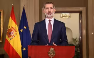 El Rey ha optado por una escenografía inédita hasta ahora en sus discursos, que suele hacer sentado. En esta ocasión, ha preferido hablar de pie desde un atril forrado con un manto con el escudo de la Corona y ante dos banderas, la de España y de la Unión Europea.