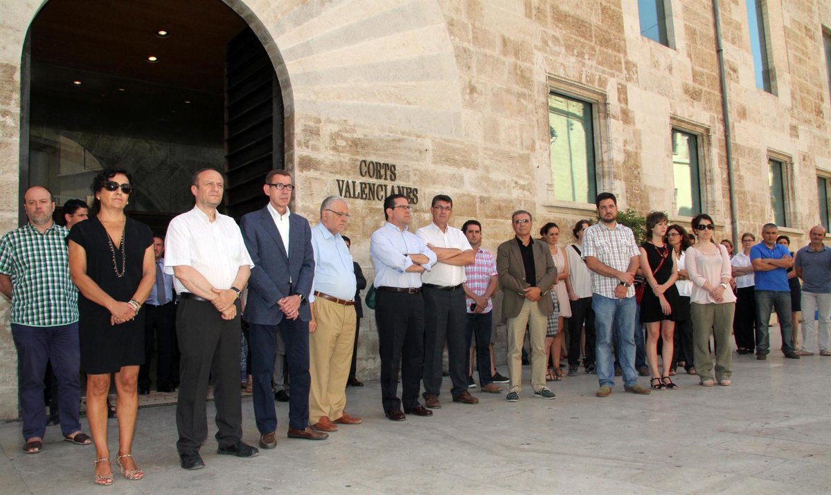 El presidente de las Cortes valencianas, Juan Cotino, diputados de los cuatro grupos parlamentarios, funcionarios y personal de la cámara autonómico han guardado a mediodía de este jueves un minuto de silencio en la puerta del Palacio de las Cortes, en señal de duelo y acompañamiento a las victimas del accidente ferroviario ocurrido en Santiago de Compostela.