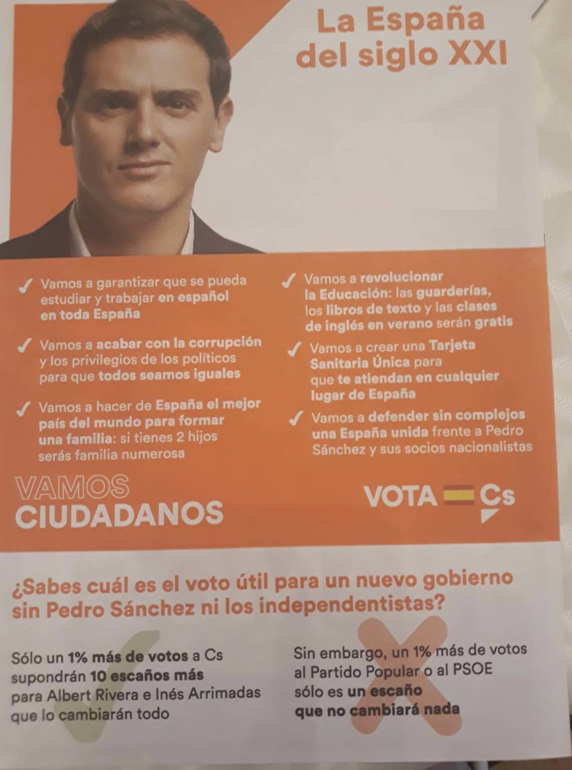 En la tradicional carta electoral enviada a los ciudadanos, la formación naranja subraya que "sólo un 1% más de votos a Cs supondrán 10 escaños más para Albert Rivera e Inés Arrimadas que lo cambiarán todo". En cambio, si ese mismo apoyo lo recibe el PP o el PSOE "sólo es un escaño que no cambiará nada".