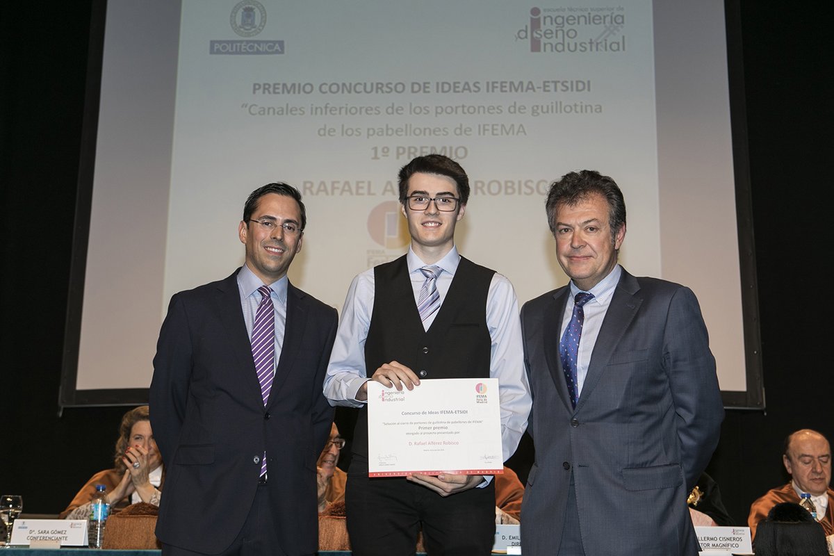 Responsables la Dirección Técnica de IFEMA, Javier Martín, director, y Santiago López, jefe del área, hicieron entrega de los Premios de reconocimiento a la excelencia a los tres estudiantes ganadores, en el marco del acto anual de entrega de Diplomas y Distinciones de la ETSIDI, presidido por el rector de la Universidad Politécnica de Madrid, Guillermo Cisneros Pérez; el director de la la Escuela Técnica Superior de Ingeniería y Diseño Industrial, Emilio Gómez García.