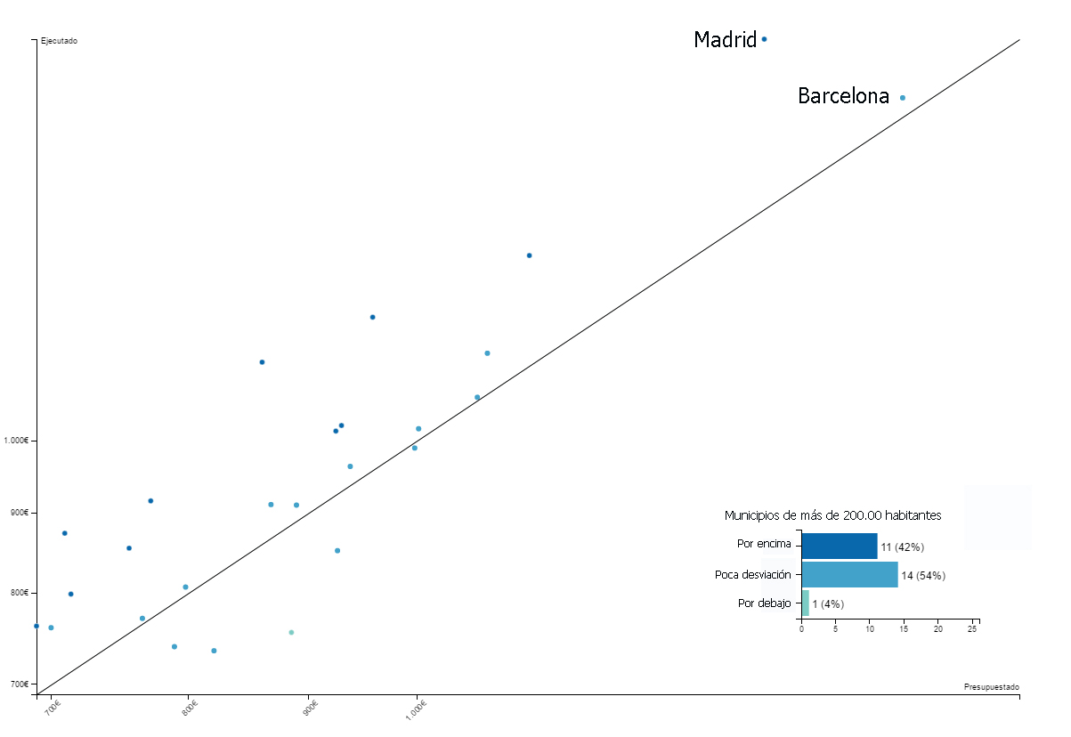 Entre los grandes municipios, Hospitalet de Llobregat y Madrid son los ayuntamientos que más se desviaron en 2014, un 30 y un 28%, respectivamente. Barcelona, por contra, se mantuvo bastante fiel a su presupuesto, con una desviación del 3 por ciento.