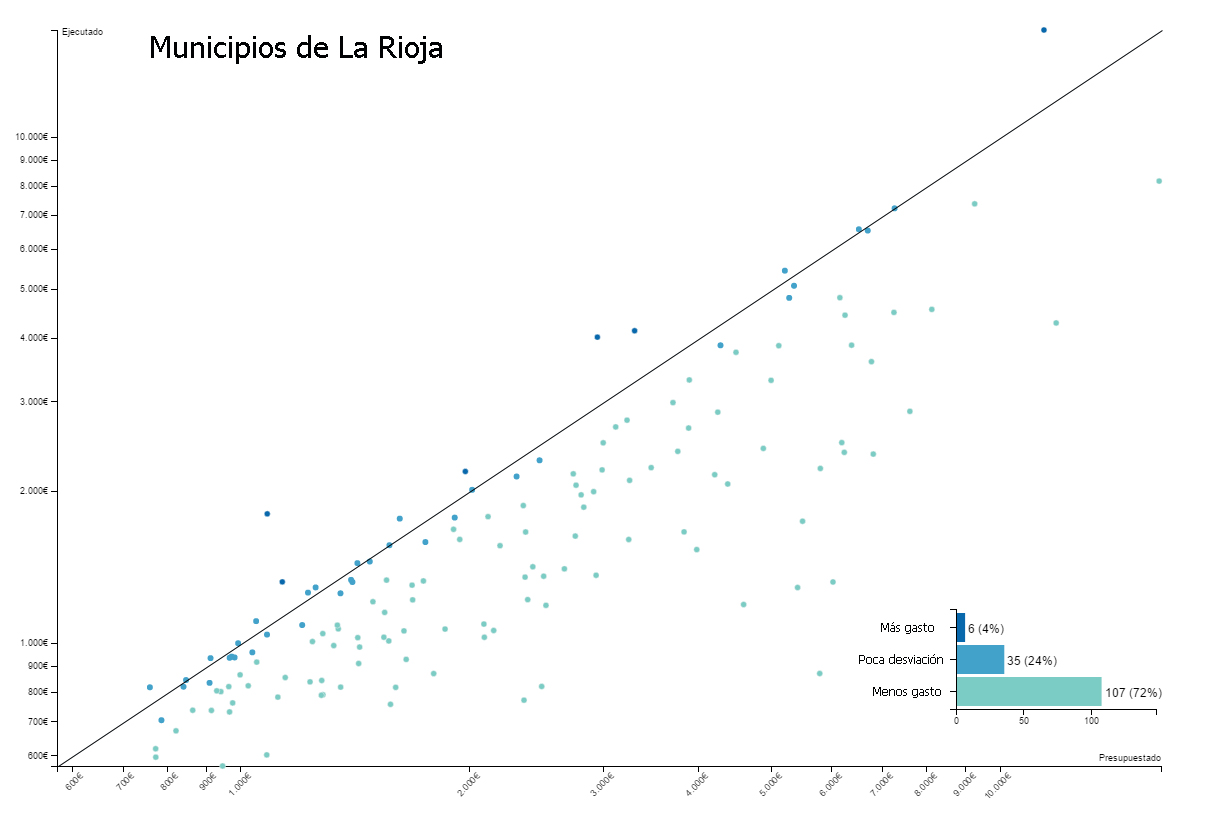 En el otro extremo, en La Rioja solamente un 24% de los municipios se ciñe a su presupuesto con una desviación del 10% o menos. La mayoría (72%) no por pasarse, sino porque no llega a ejecutar ni el 90% de su presupuesto.