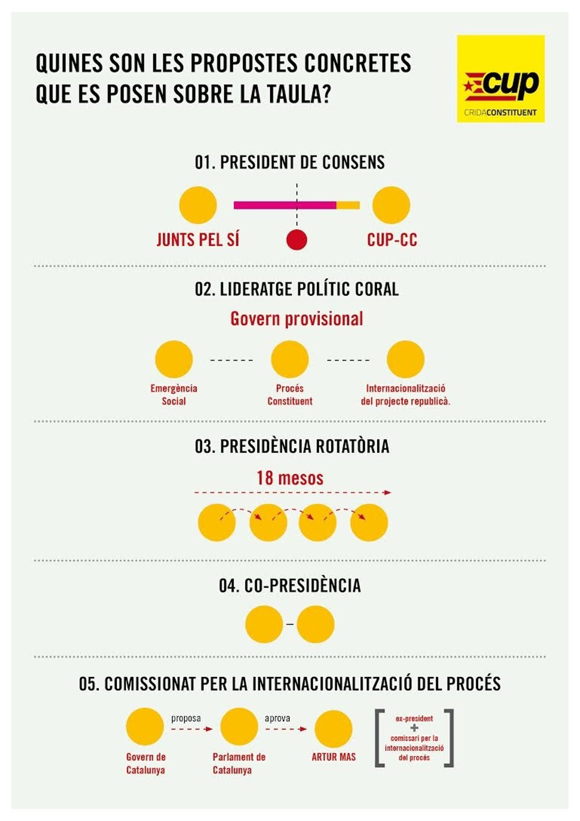La CUP ha planteado este lunes cinco propuestas a JxSí para formar un Govern no presidido por Artur Mas: un presidente de consenso o un liderazgo político coral o una presidencia rotatoria o una copresidencia, y que Mas presida un Comisionado para la internacionalización del proceso soberanista.