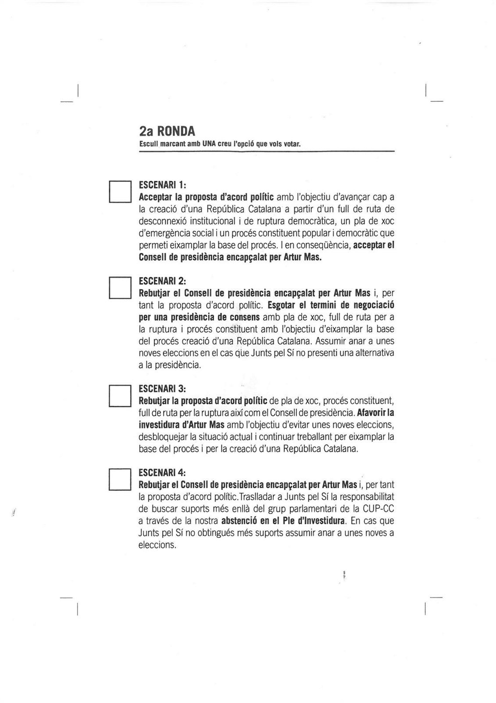 Una opción es aceptar las medidas políticas de la propuesta de JxSí y aceptar a Artur Mas como presidente; otra es rechazar a Mas y seguir negociando con JxSí; otra opción es rechazar las propuestas de JxSí pero facilitar la investidura de Mas por parte de la CUP; y otra más es rechazar la propuesta de medidas políticas y a Mas, e instar a JxSí a buscar acuerdos sin la CUP, "a través de la abstención en el pleno de investidura".
