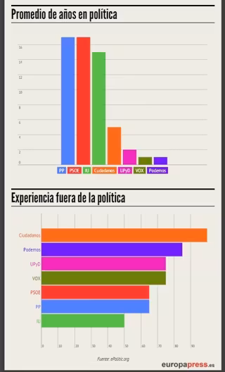 Por otro lado, PP y PSOE son los partidos con más años de experiencia en política, una media de 17. En el lado opuesto se sitúan VOX y Podemos, cuyos candidatos tienen una media de un año en política. Ahora bien, en cuanto a experiencia profesional ajena a la vida pública, es Ciudadanos el que tiene el mayor porcentaje de cabezas de lista en esta situación: todos han trabajado fuera. En el lado opuesto se sitúa IU, sólo la mitad de sus candidatos tienen experiencia laboral ajena a la política.